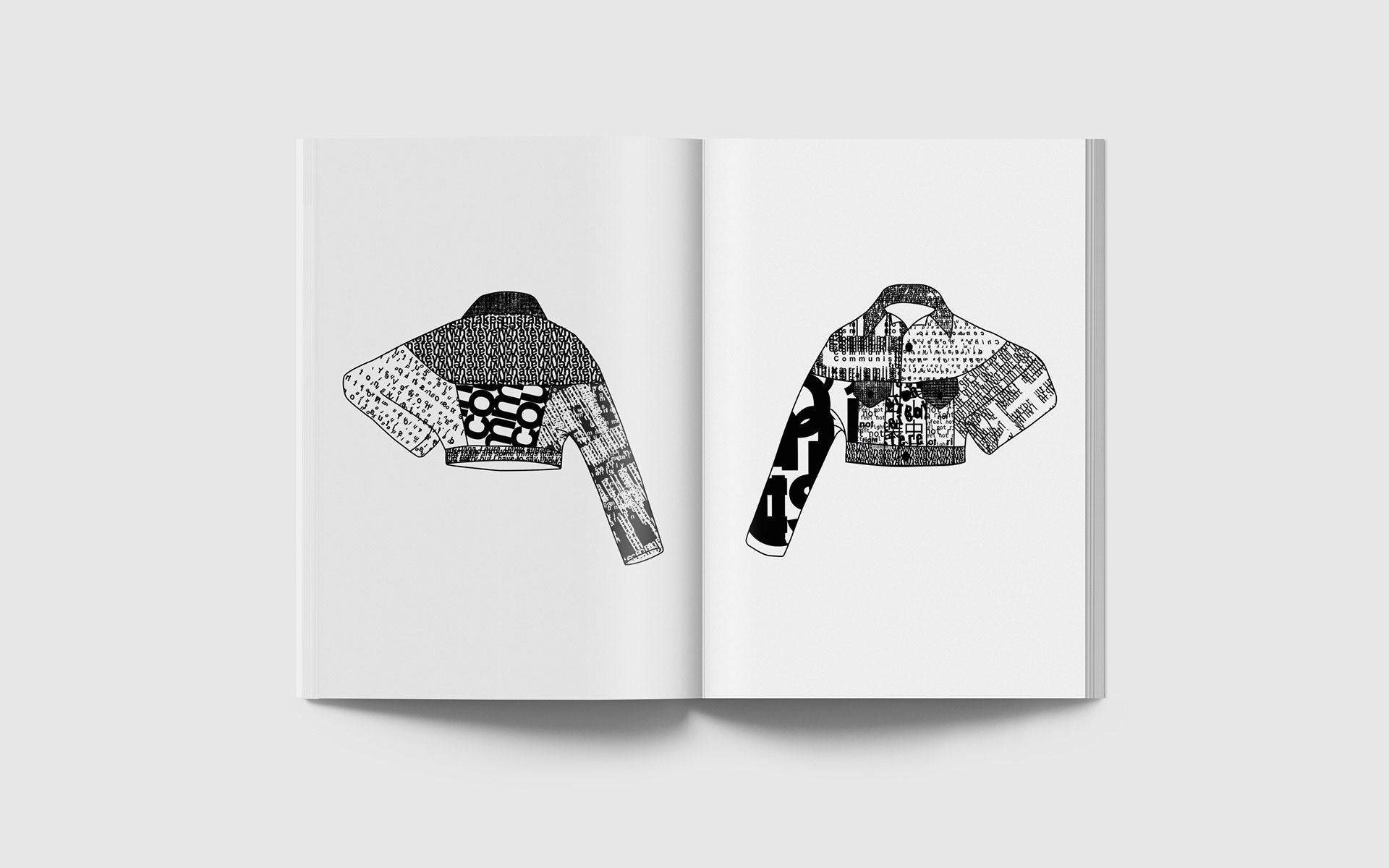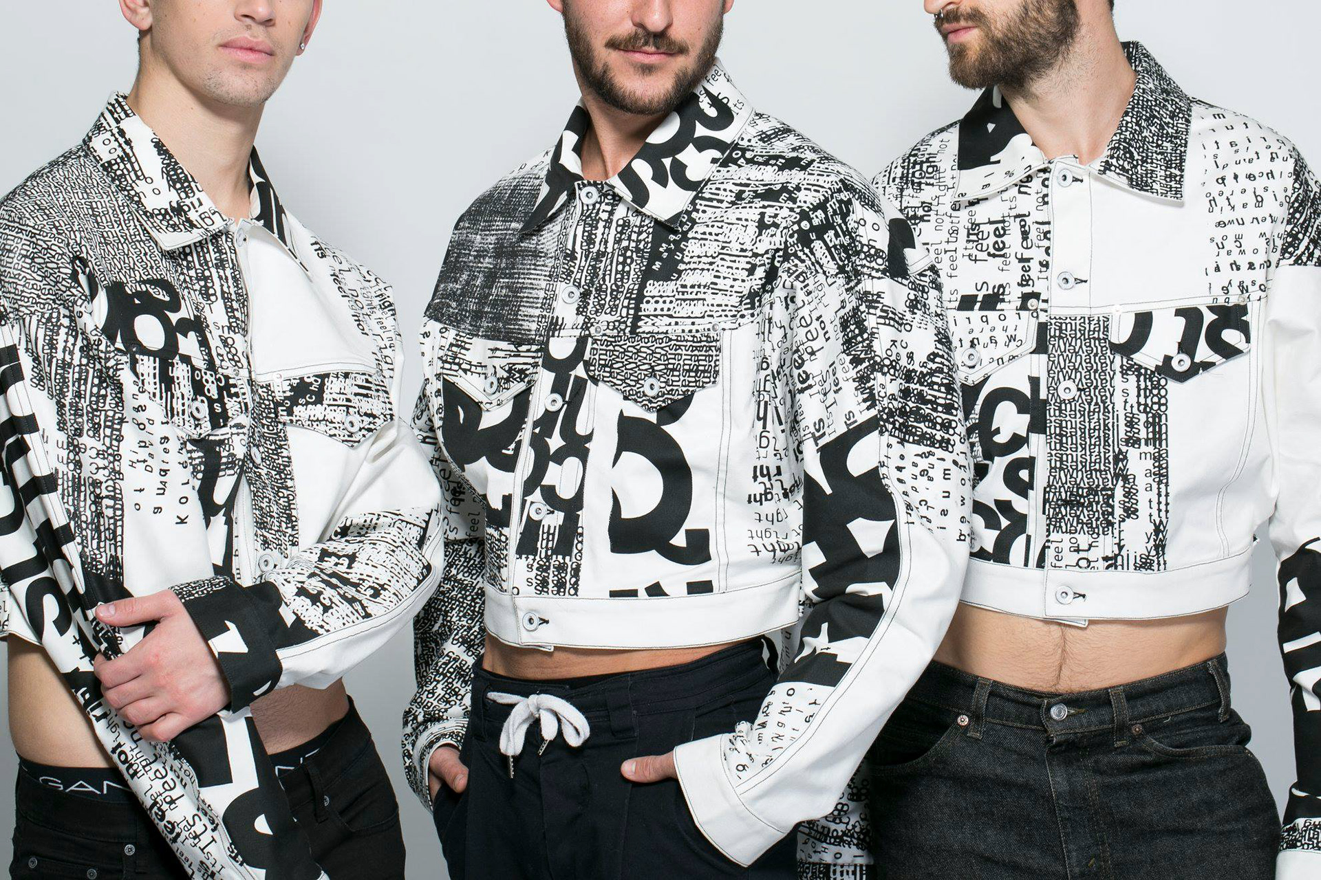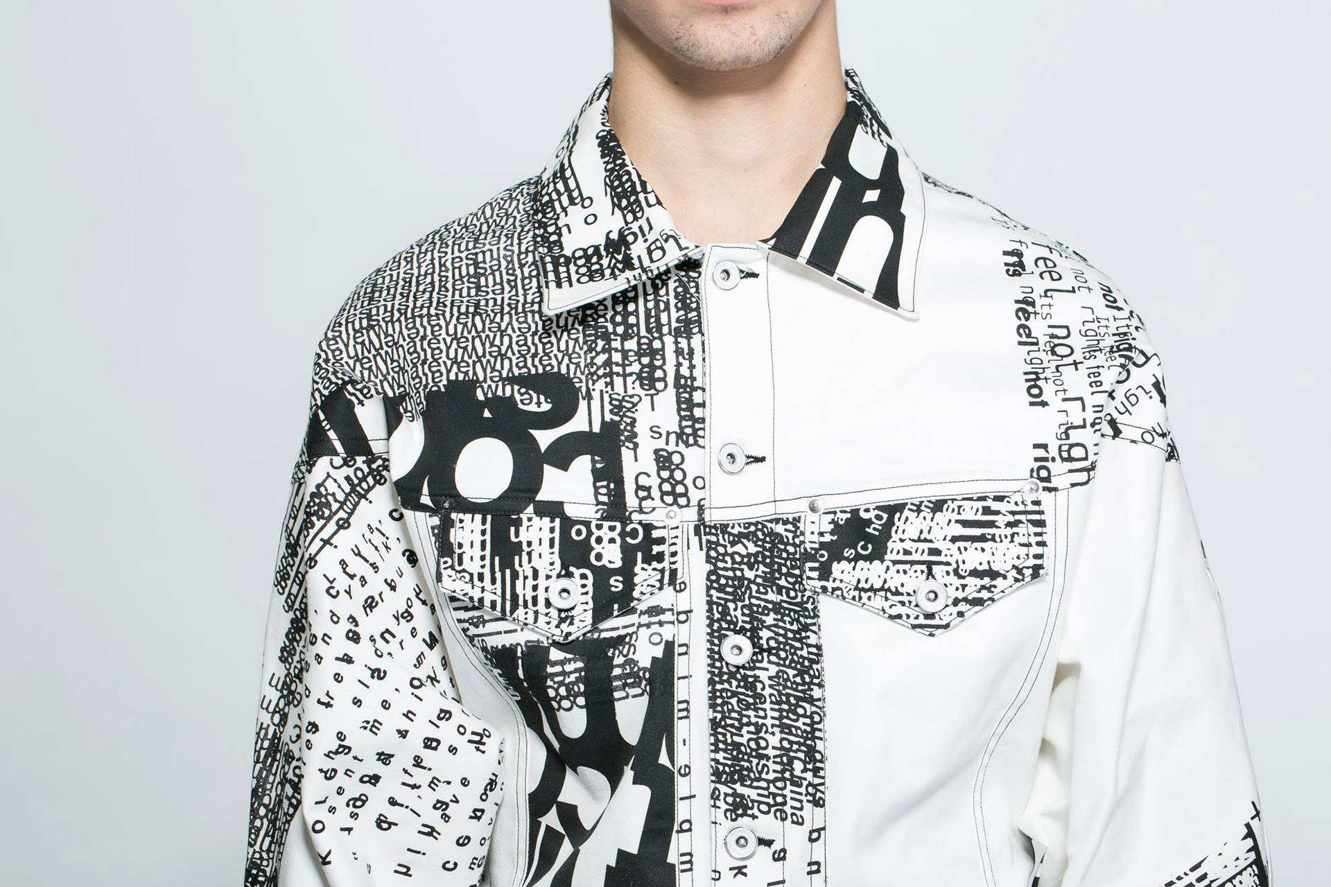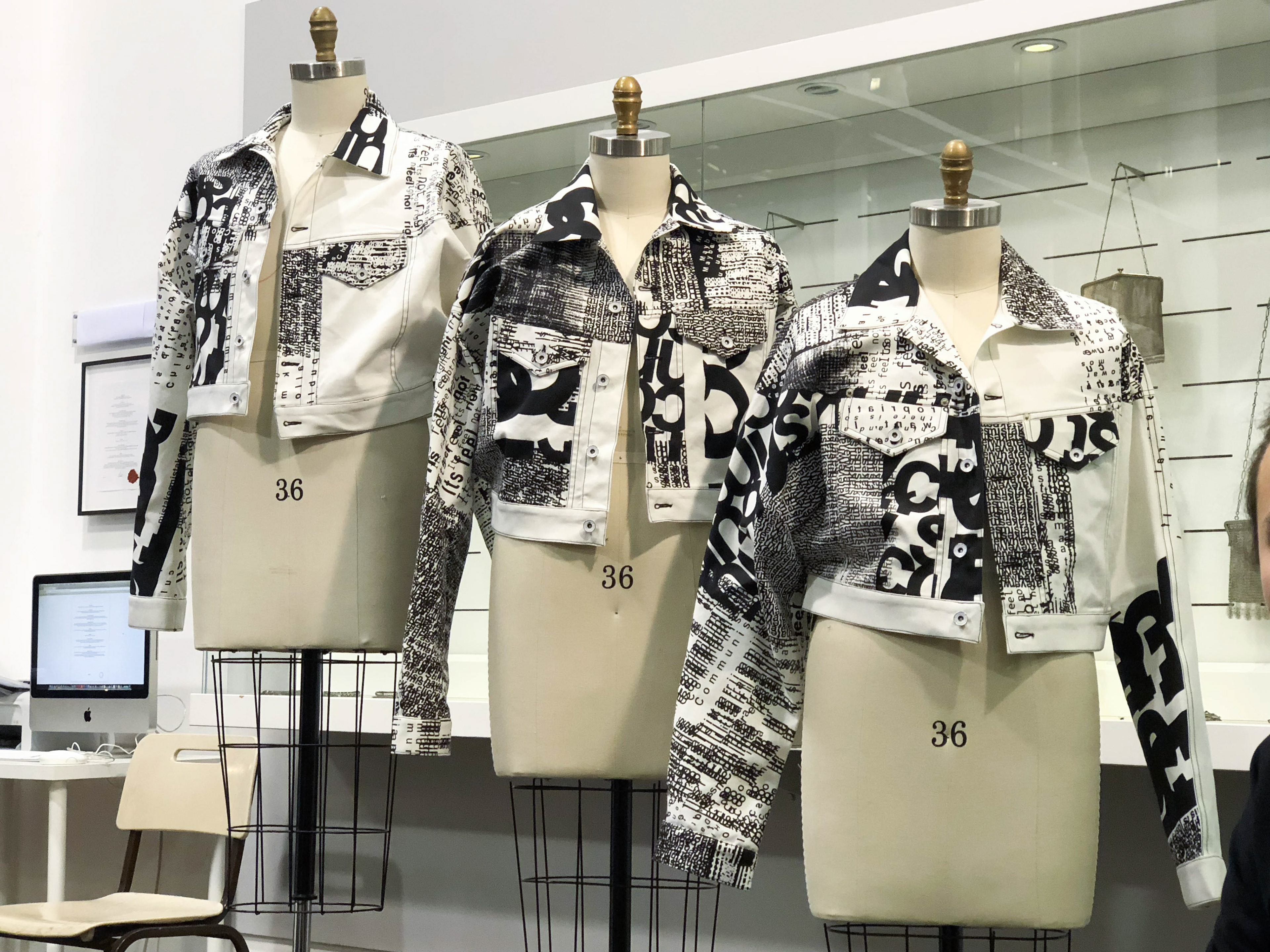 created as part of a collaborative educational program, the three ‘disruption jackets’ are inspired by the difficulties in communication between Chinese and Israeli students at shenkar college, Israel and yale university, the US. the black and white denim is covered with letters and words falling apart.