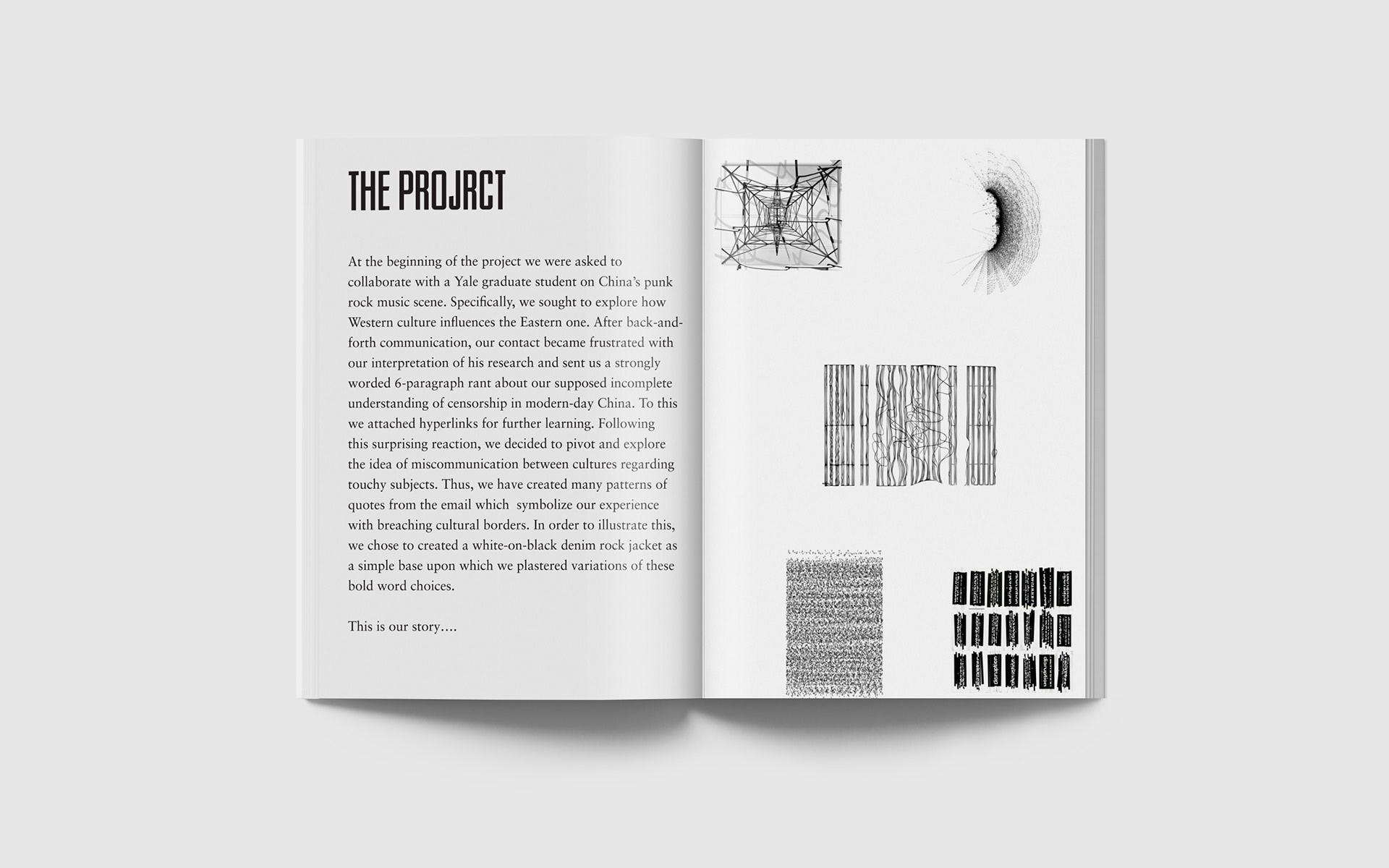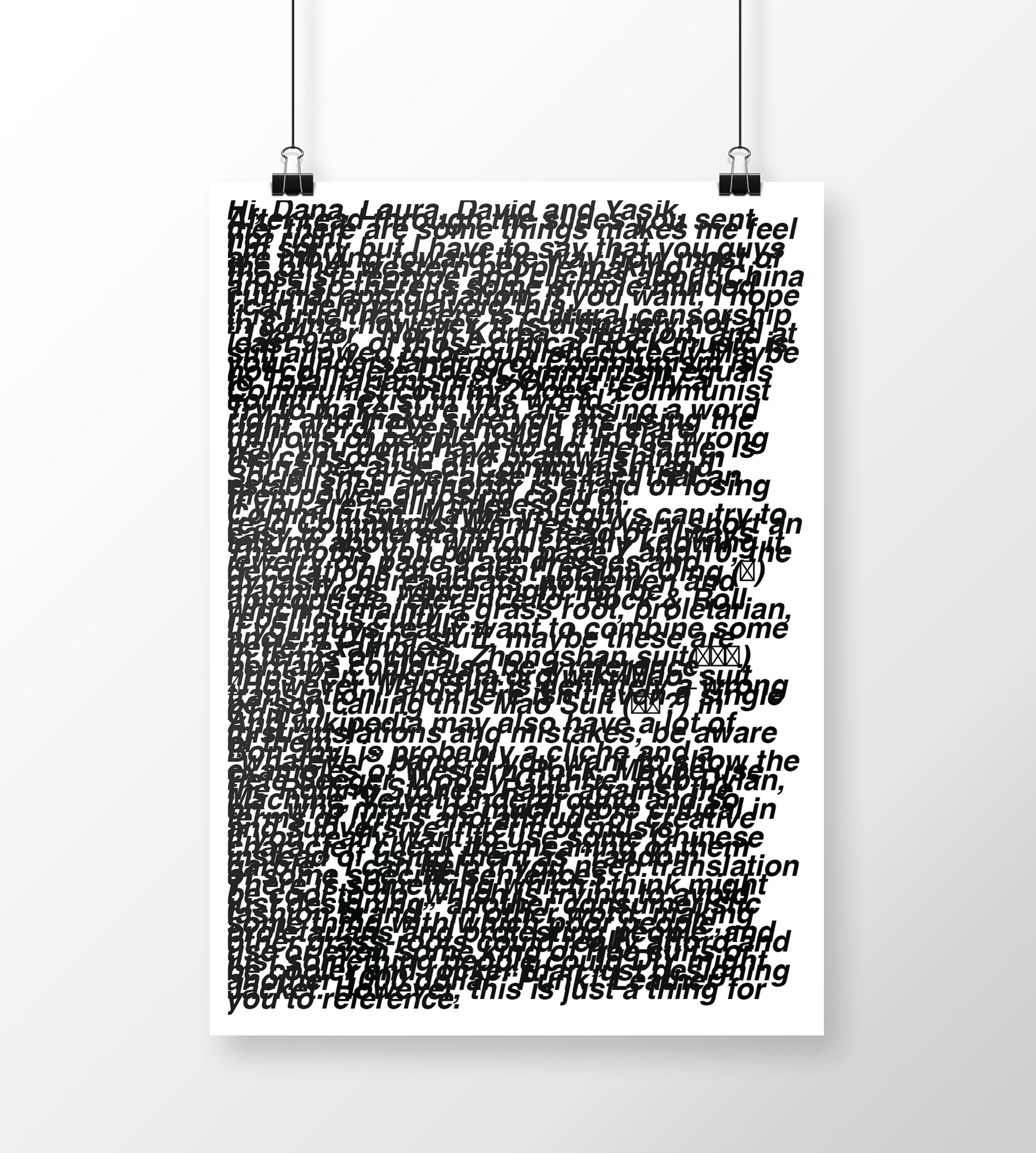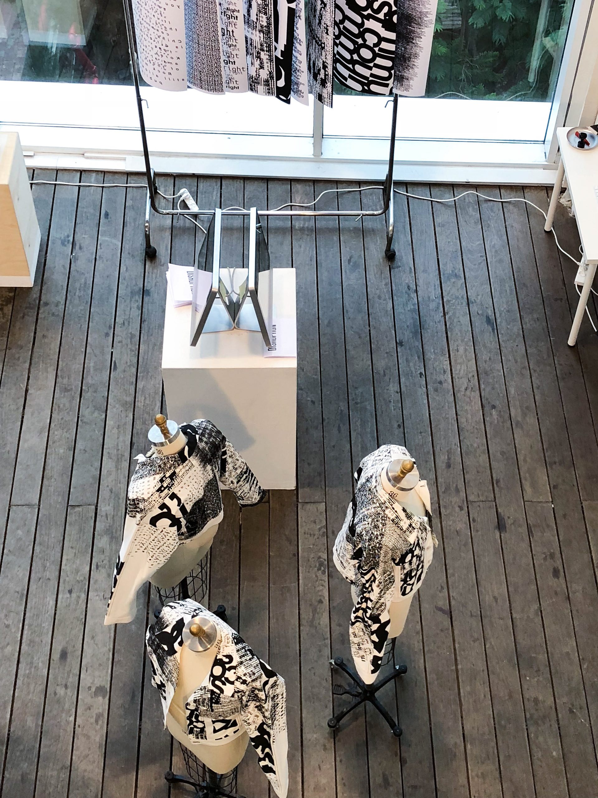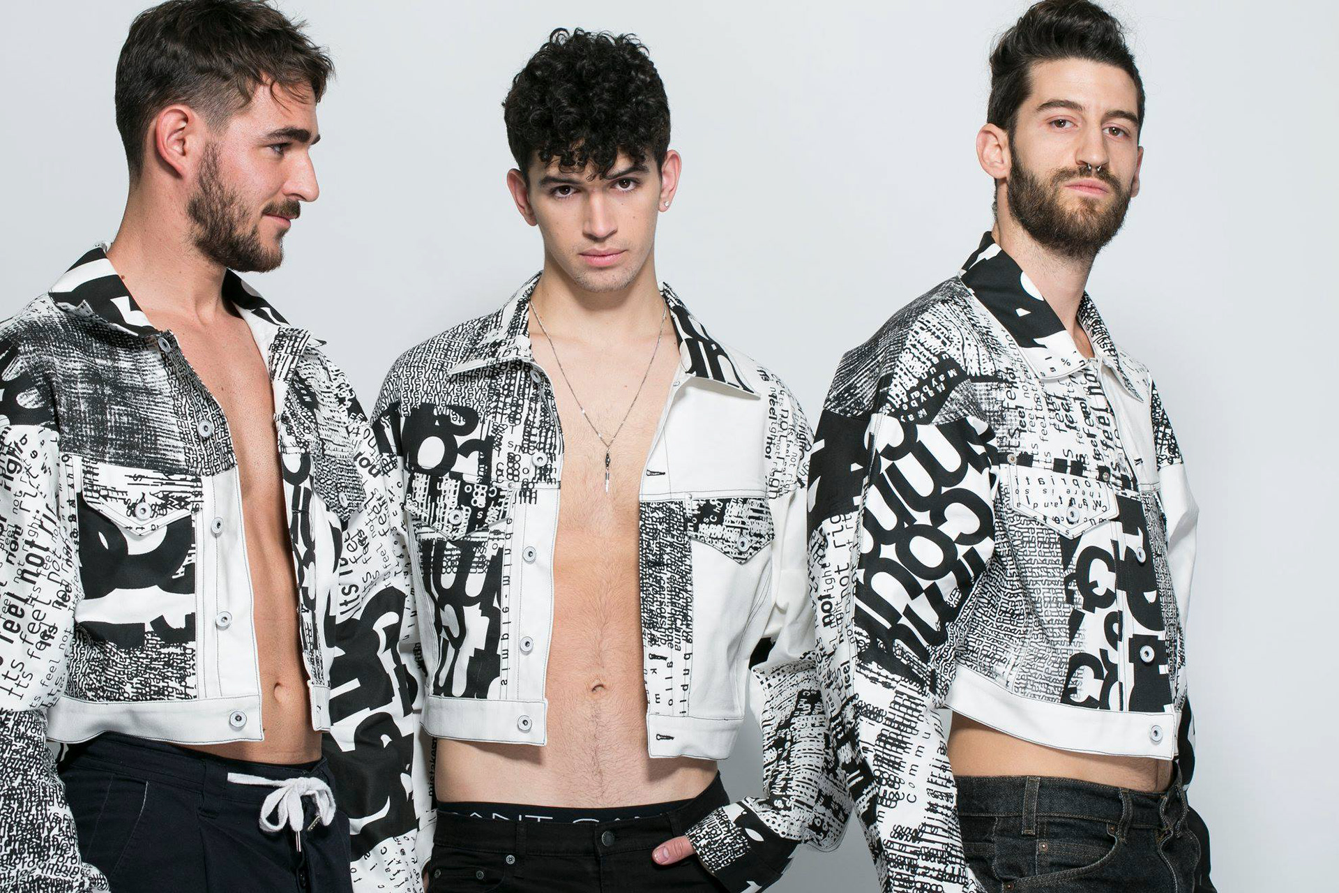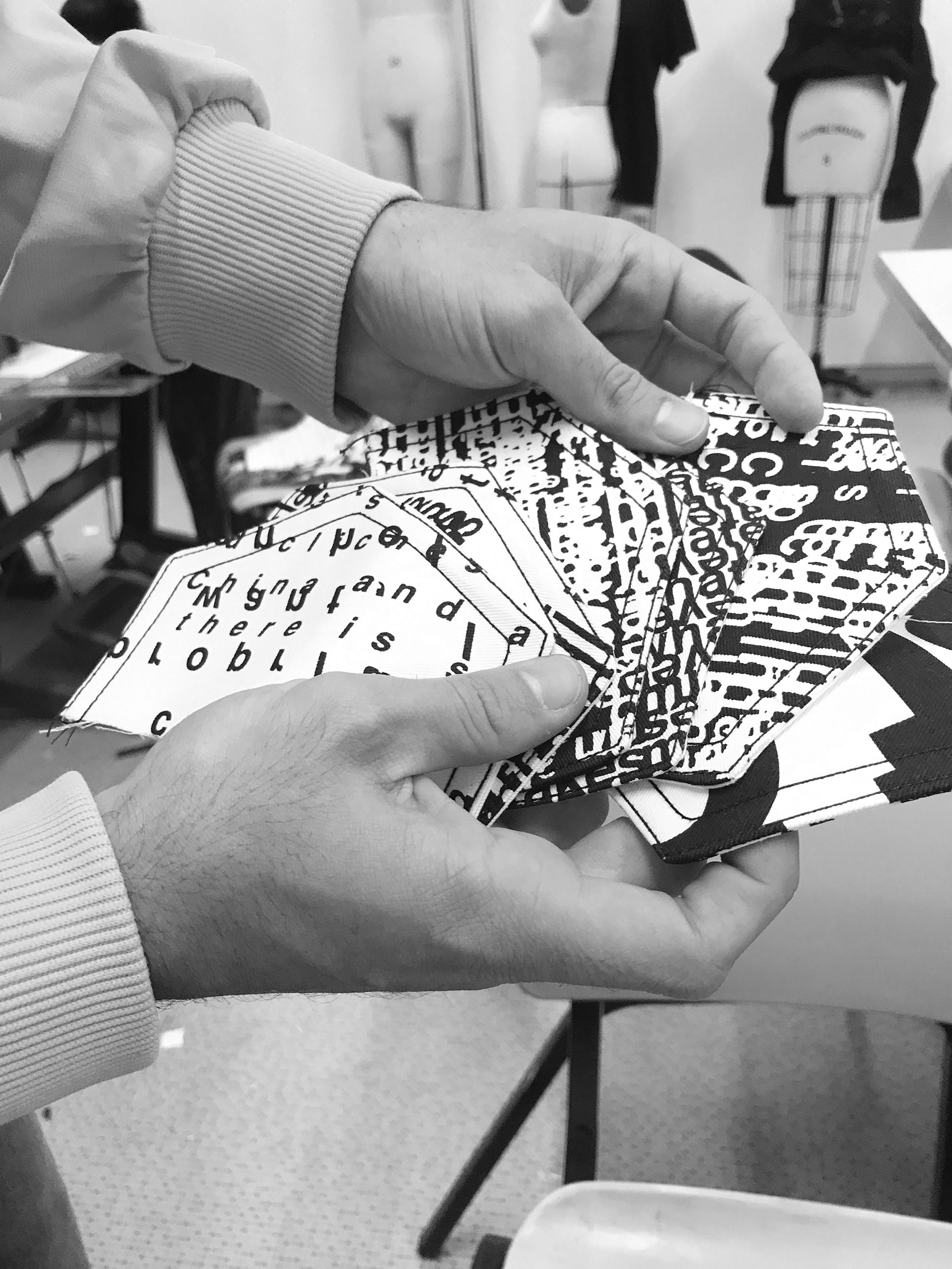 created as part of a collaborative educational program, the three ‘disruption jackets’ are inspired by the difficulties in communication between Chinese and Israeli students at shenkar college, Israel and yale university, the US. the black and white denim is covered with letters and words falling apart.