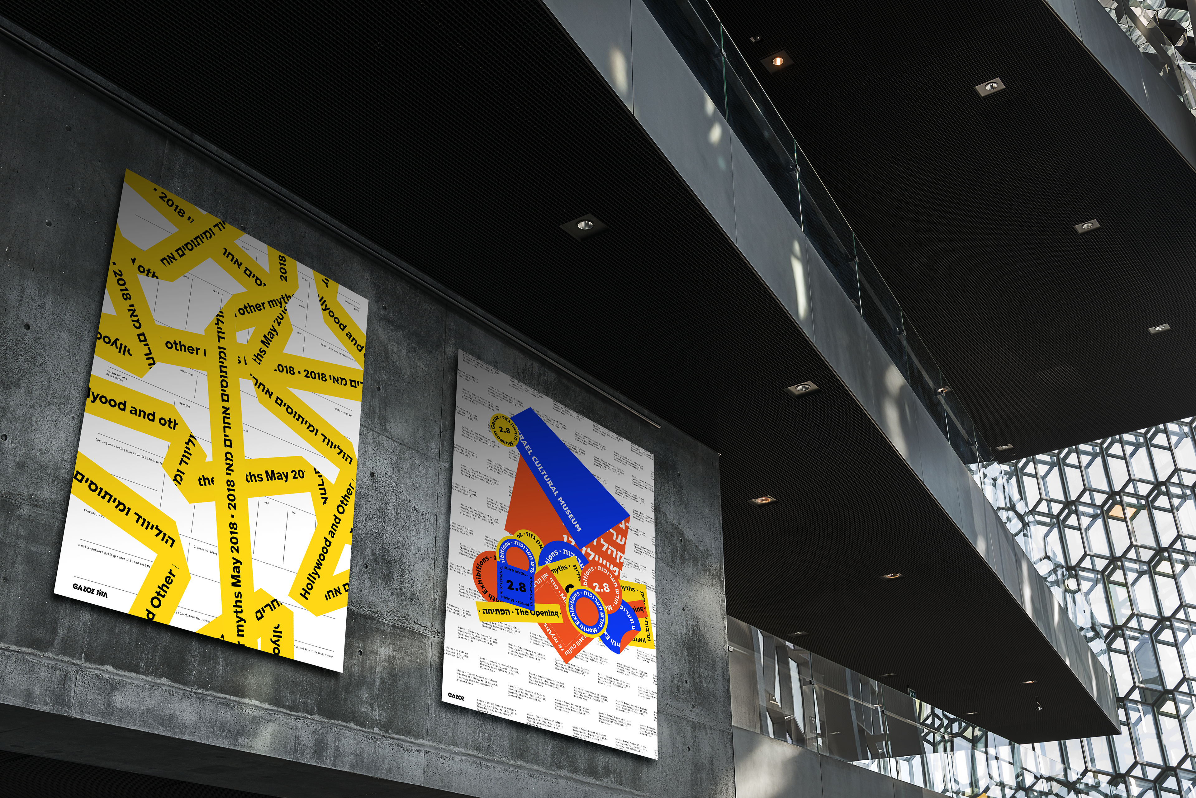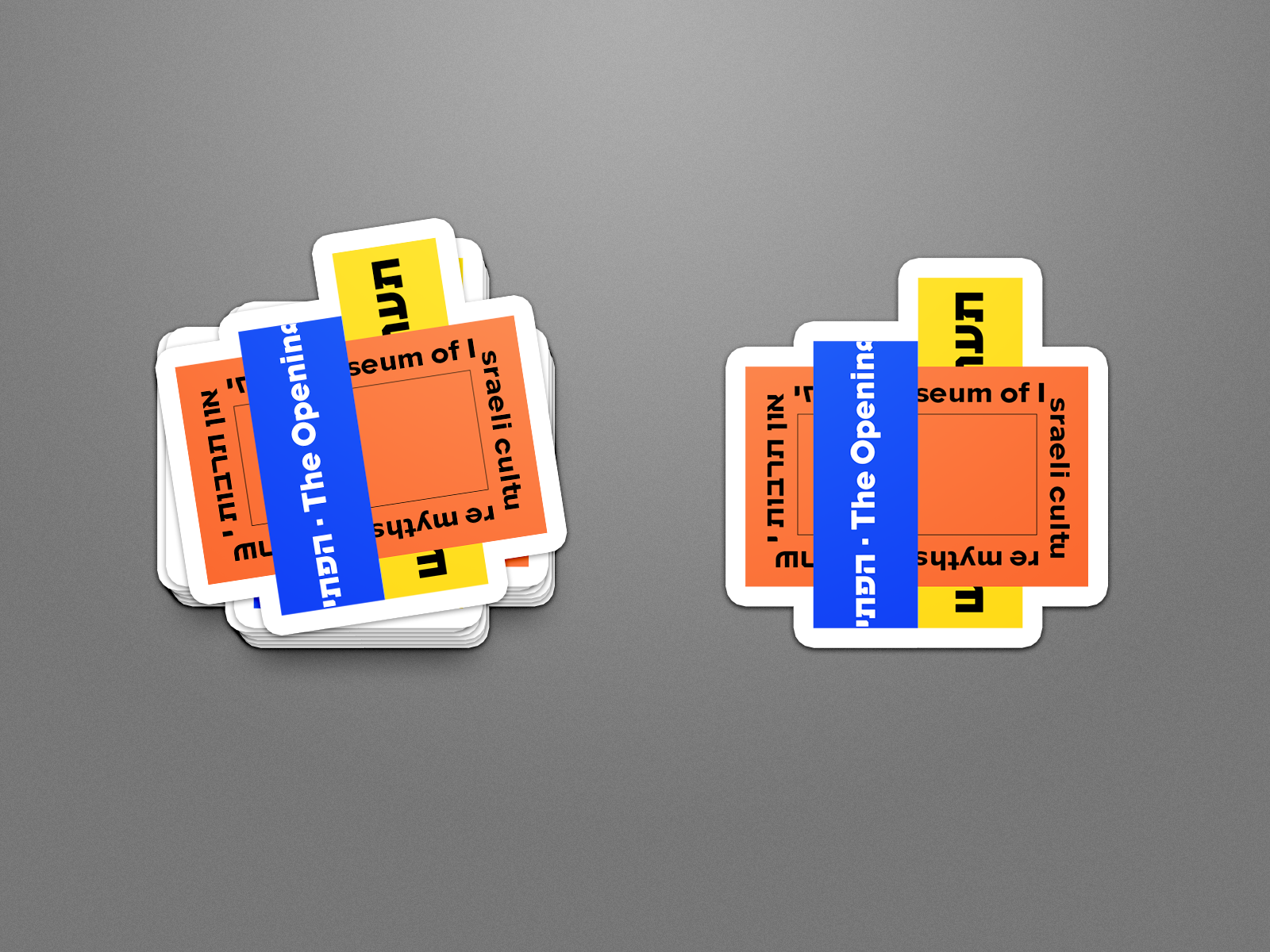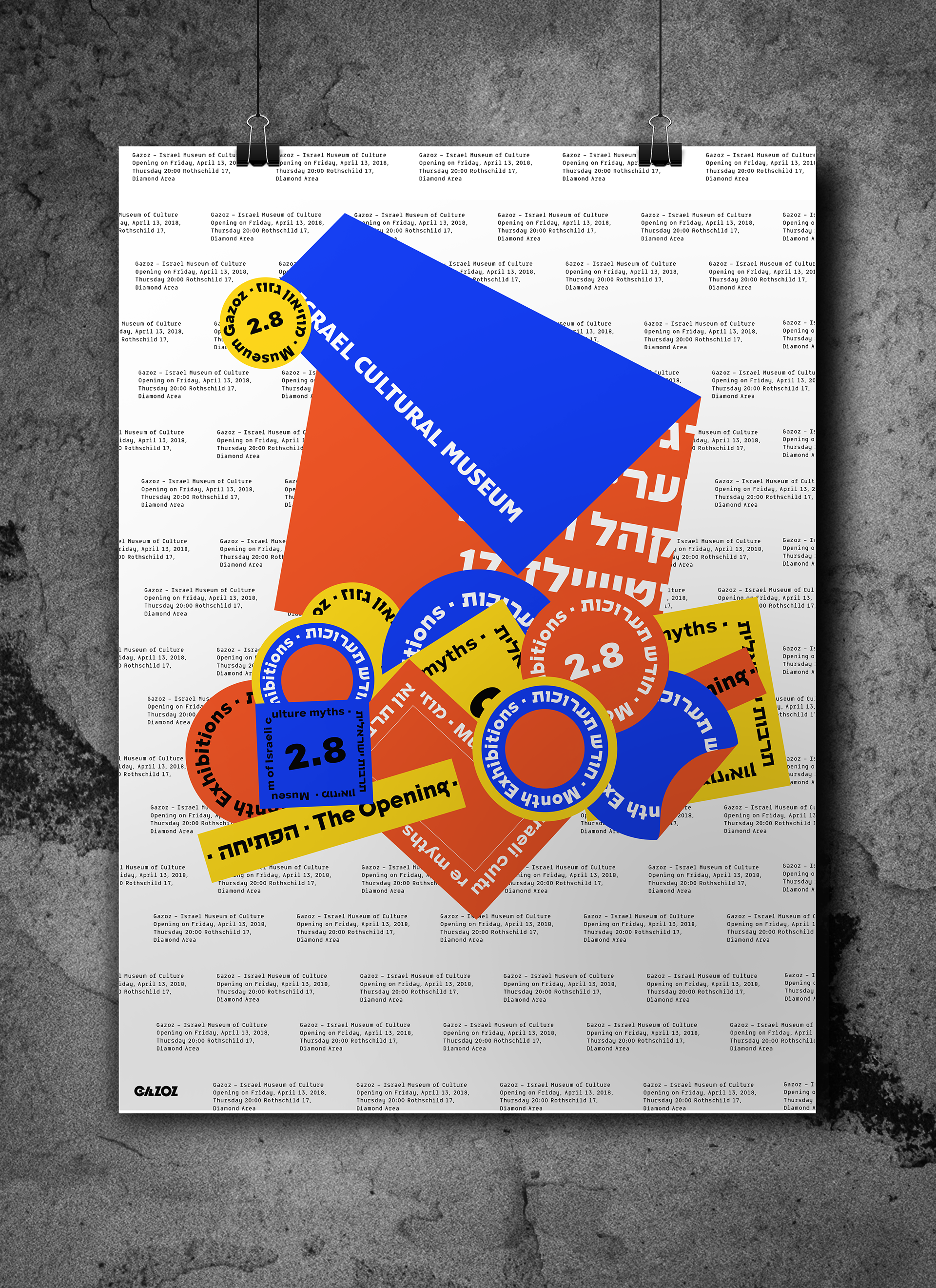 Branding of "Gazoz Museum of Israeli culture" The colors used are of the Mediterranean sands, sea, and sun. I was inspired by the amount of stickers that vary, represent and express, the multitude of cultural connections in Israel. My design is based on the informative, somewhat boring and mundane side of the Museum in contrast of the sassy, unpretentious Israeli side that's glued on layers and layers of different views and expressive ideas. I chose a naked cement wall that in my view symbolizes true and hard israeliness.
