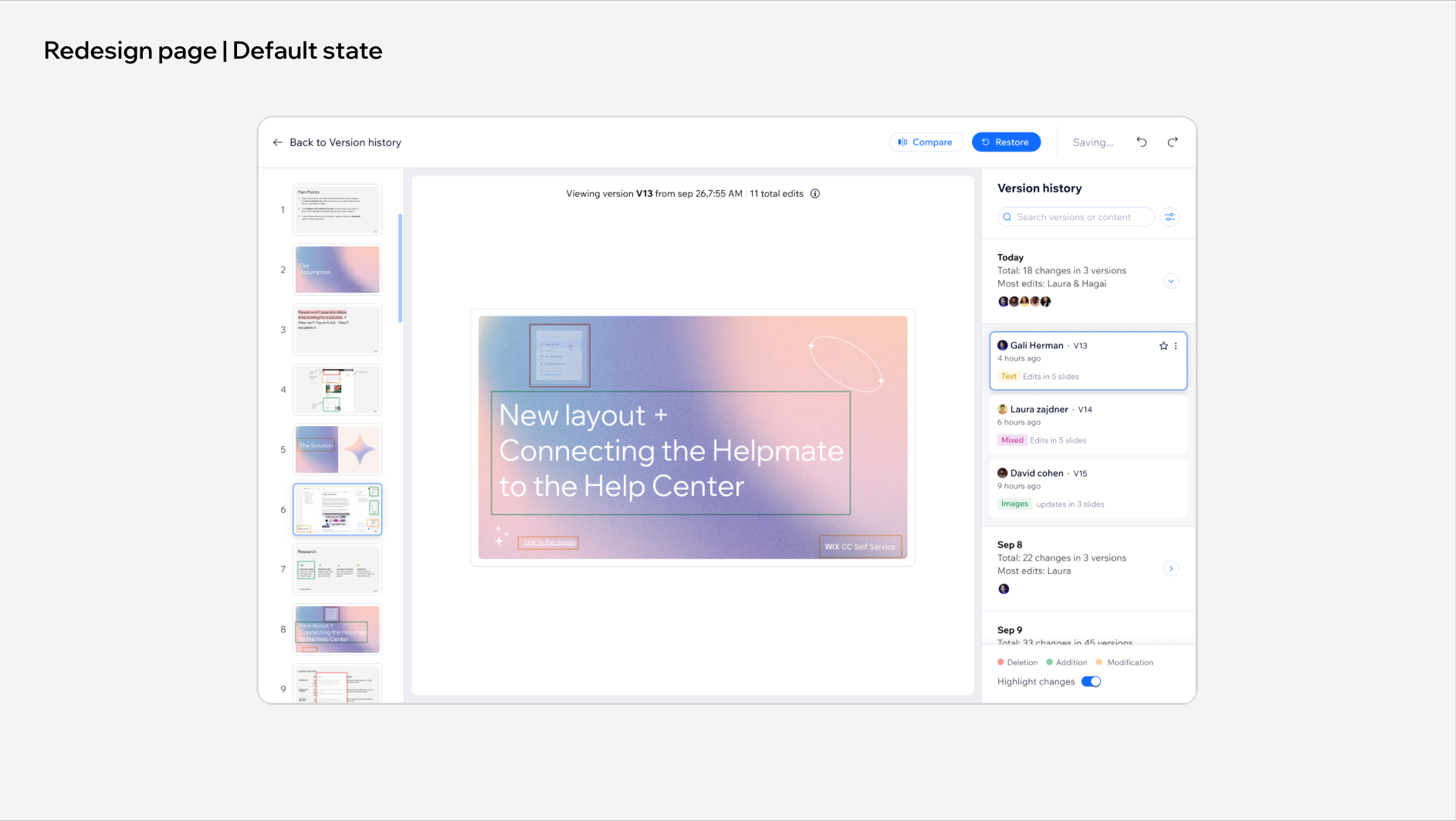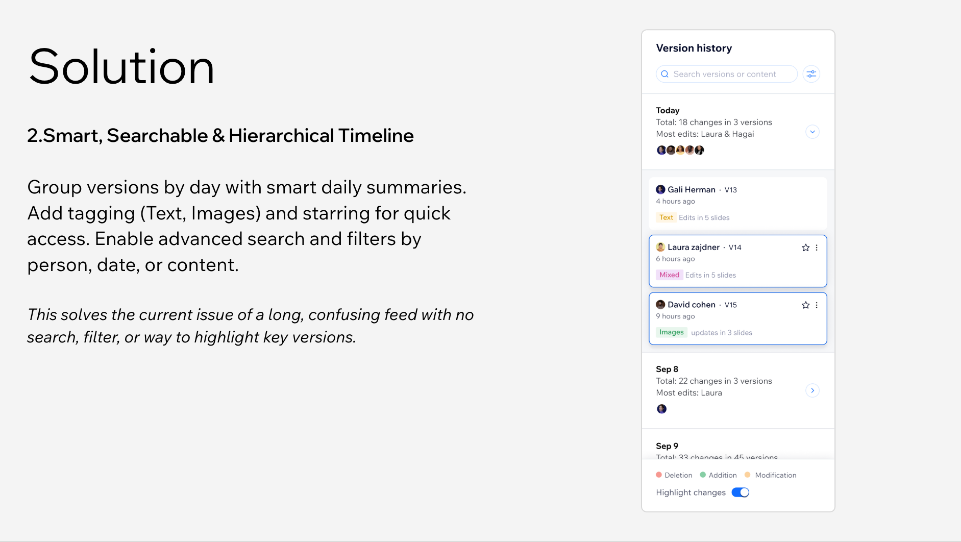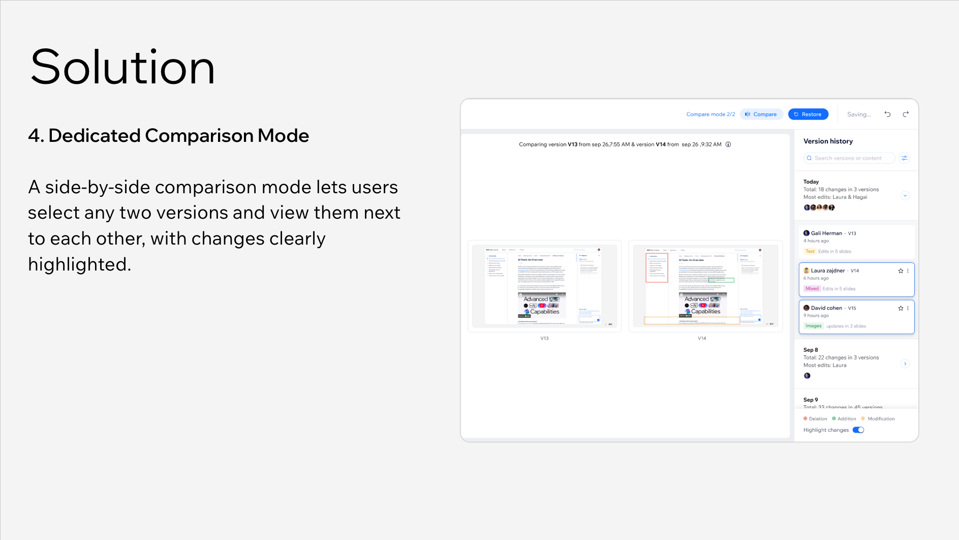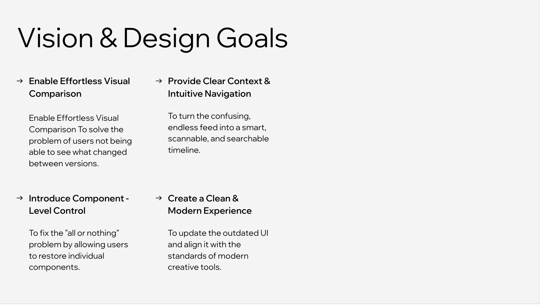 I redesigned Google’s version history experience to improve clarity, scannability, and decision-making in high-density workflows. The focus was on reducing cognitive load, strengthening visual hierarchy, and helping users understand changes and restore confidence faster.